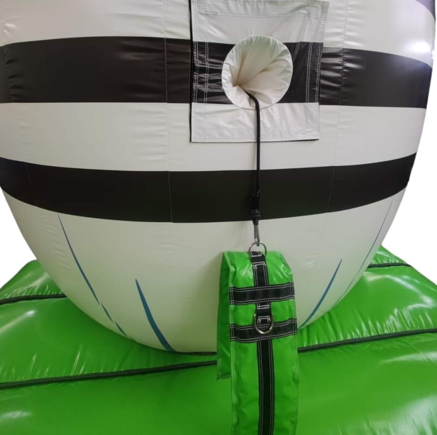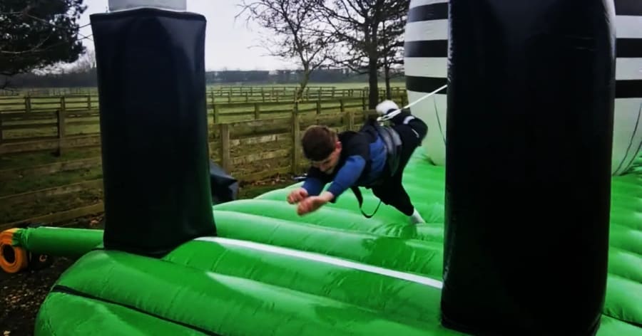 • Players wear harnesses attached to bungee cords, testing their strength and agility as they run against each other down the inflatable.