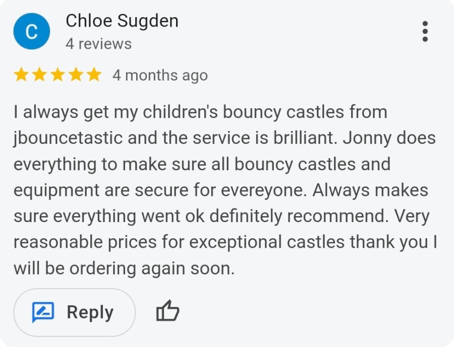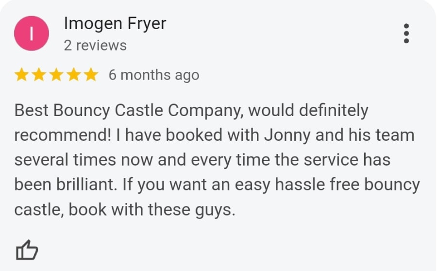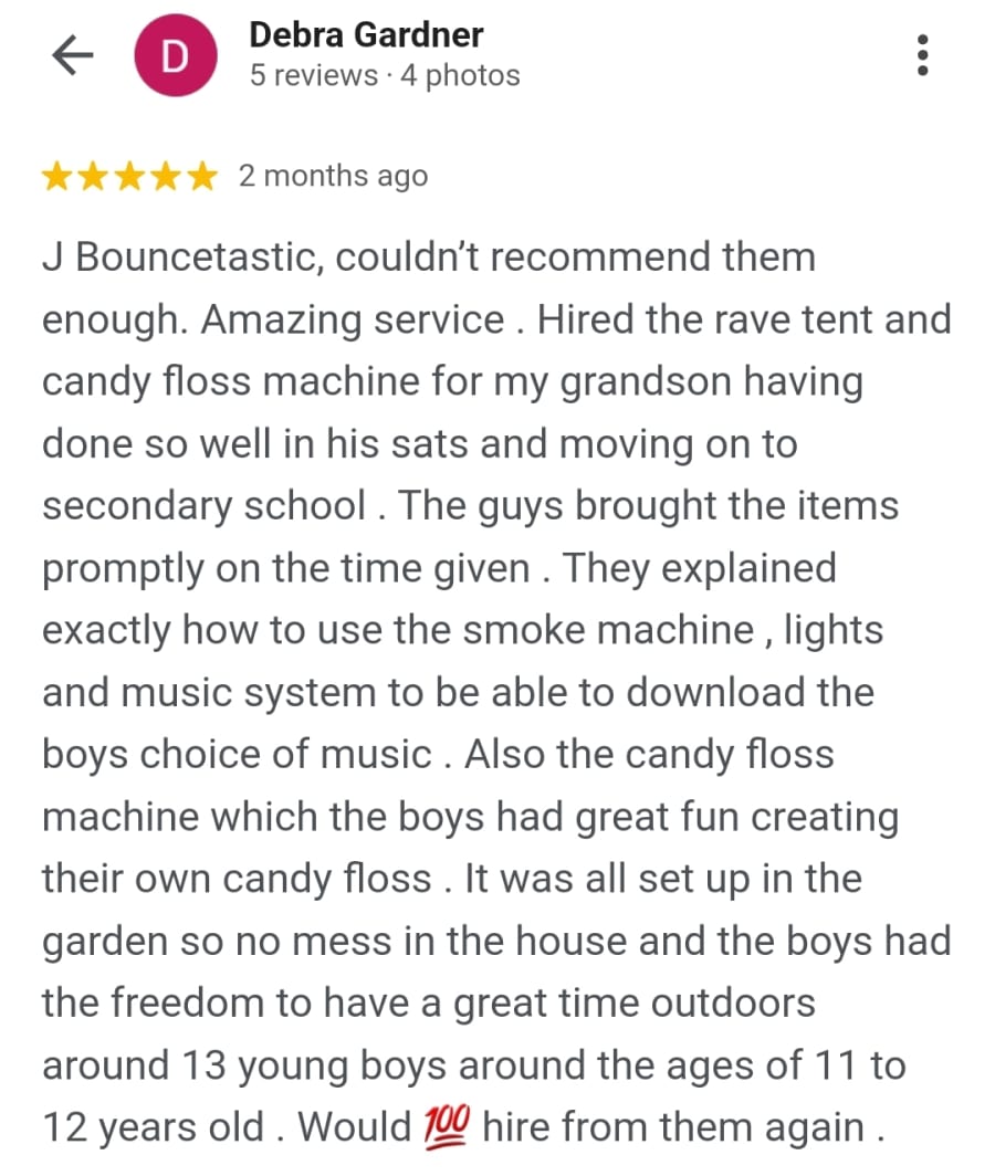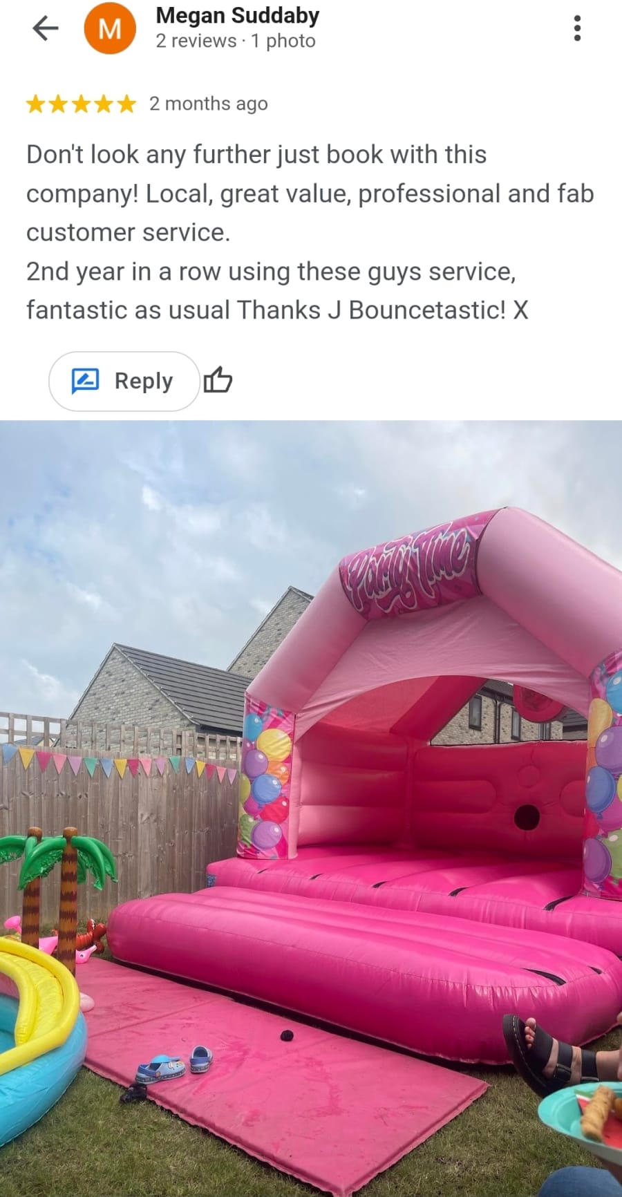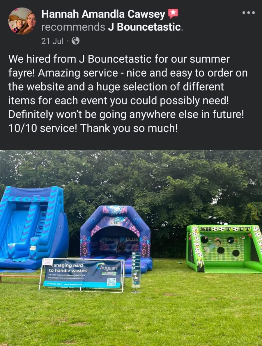 In this section, you will find testimonials and reviews from our happy and satisfied customers who have used our products or services. We take pride in providing an extraordinary experience to our customers and believe that their feedback is essential to our growth and success. Whether you are skeptical about our offerings or are already a loyal customer, reading the experiences and opinions of others can help you make an informed decision. Dive in to discover what our customers have to say about us and how we have helped them achieve their desired outcomes. Feel free to contact us on 07775080994 or head over to our Contact J Bouncetastic if you have any enquiries or take a look at what we have to offer All Products