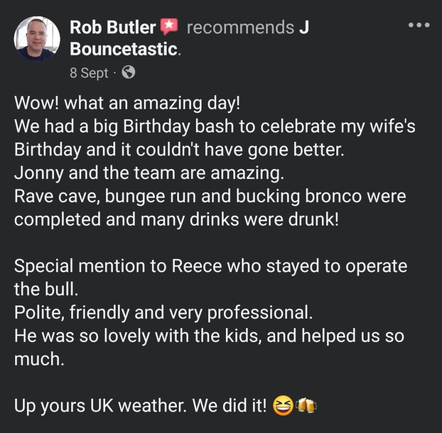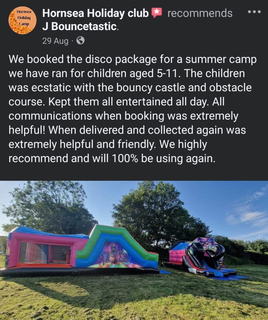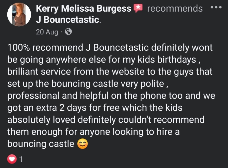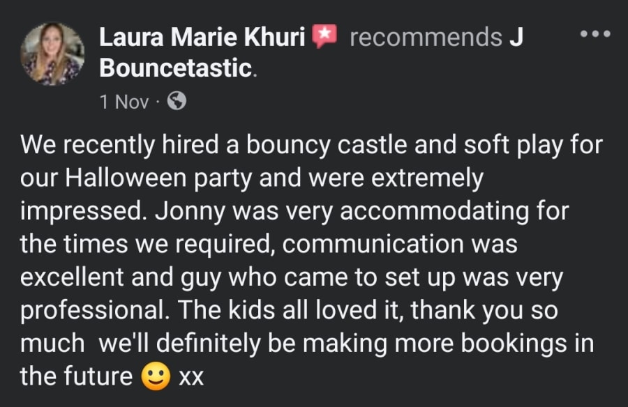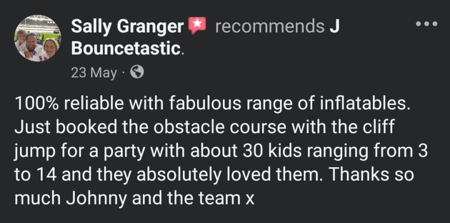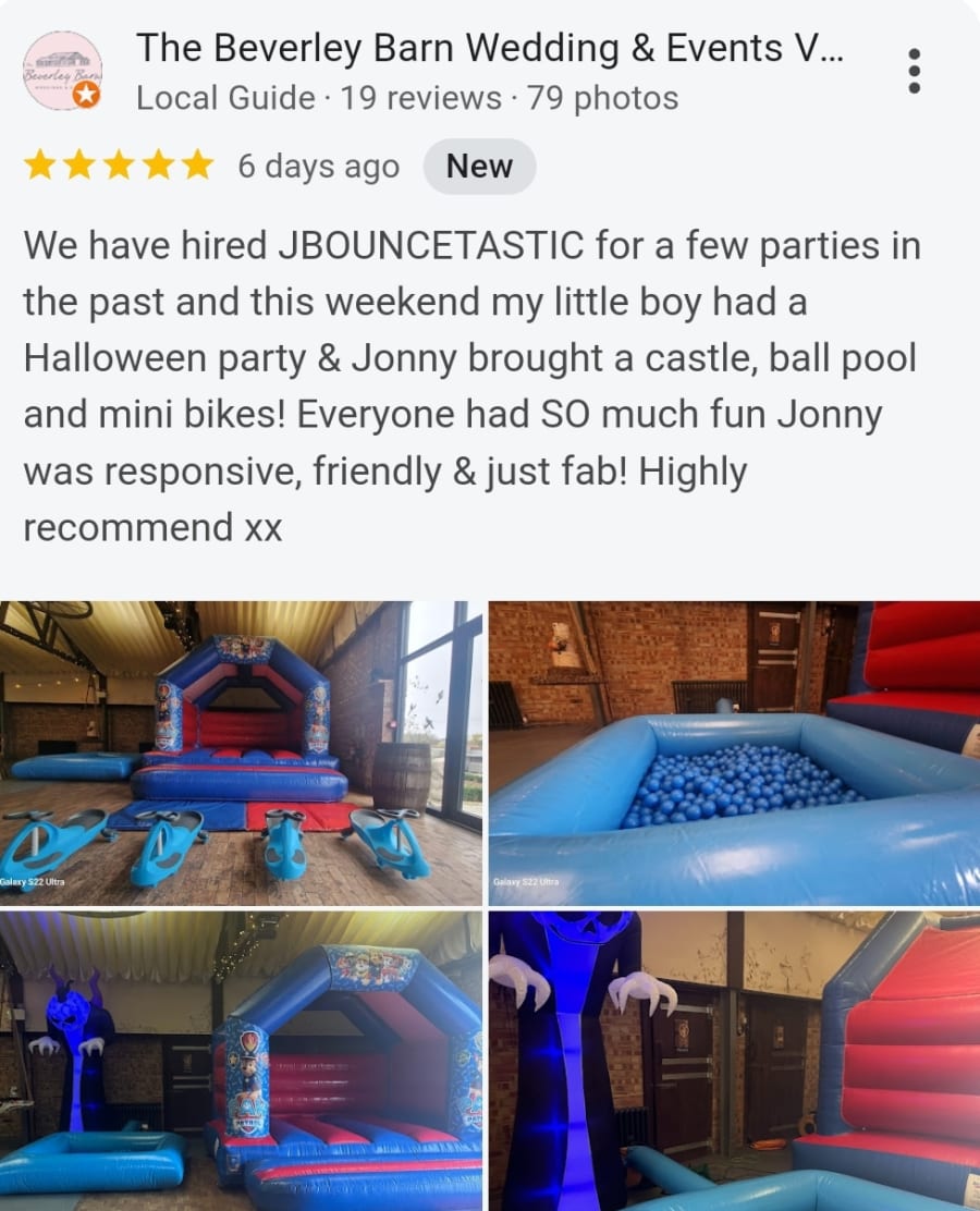 In this section, you will find testimonials and reviews from our happy and satisfied customers who have used our products or services. We take pride in providing an extraordinary experience to our customers and believe that their feedback is essential to our growth and success. Whether you are skeptical about our offerings or are already a loyal customer, reading the experiences and opinions of others can help you make an informed decision. Dive in to discover what our customers have to say about us and how we have helped them achieve their desired outcomes. Feel free to contact us on 07775080994 or head over to our Contact J Bouncetastic if you have any enquiries or take a look at what we have to offer All Products