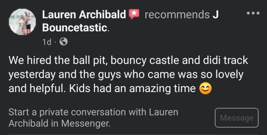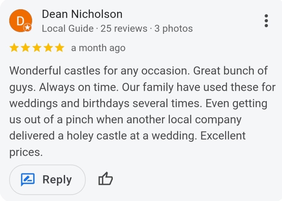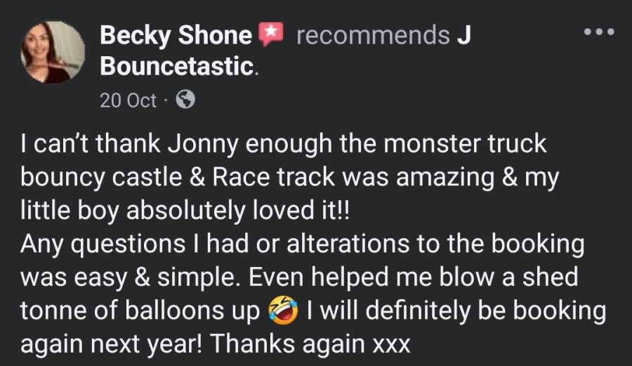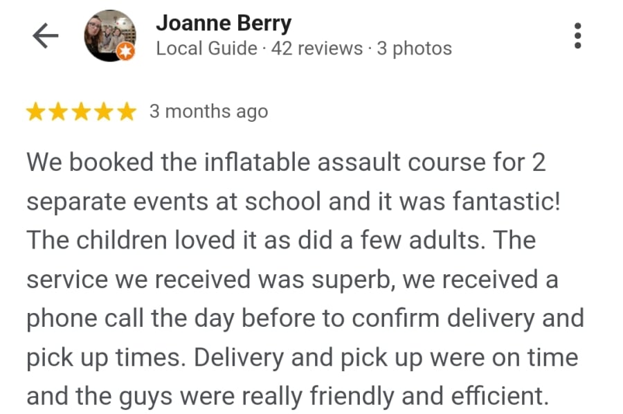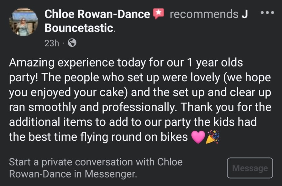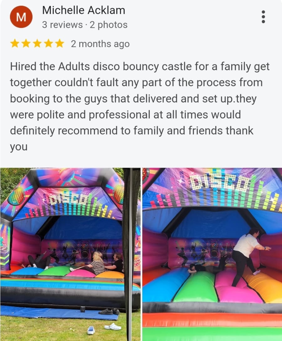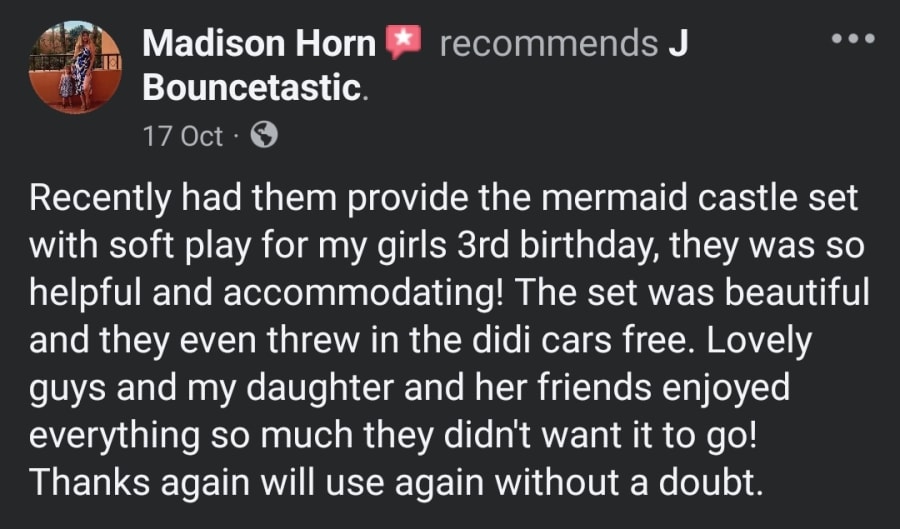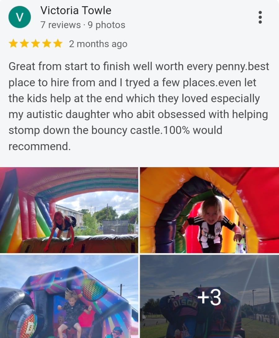 In this section, you will find testimonials and reviews from our happy and satisfied customers who have used our products or services. We take pride in providing an extraordinary experience to our customers and believe that their feedback is essential to our growth and success. Whether you are skeptical about our offerings or are already a loyal customer, reading the experiences and opinions of others can help you make an informed decision. Dive in to discover what our customers have to say about us and how we have helped them achieve their desired outcomes. Feel free to contact us on 07775080994 or head over to our Contact J Bouncetastic if you have any enquiries or take a look at what we have to offer All Products
